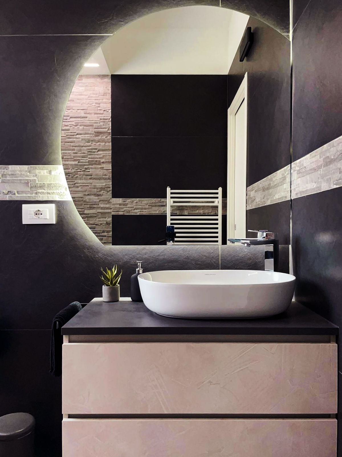 A spezzare i forti contrasti è il mobile bagno, la texture scelta è in linea con l'ambiente ma il colore è caldo e neutro.