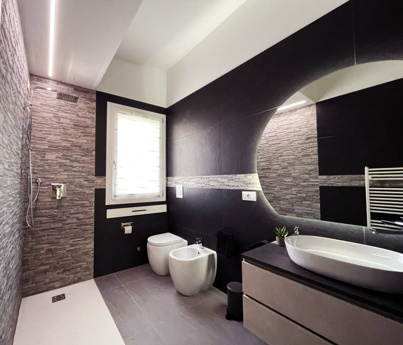 Il pavimento scelto è antracite mentre le pareti, sempre in gres porcellanato effetto pietra, sono nere. Per la parete della doccia, e come decoro sulle restanti, è stato scelto un effetto pietra sui toni del grigio. E' sicuramente il gioco di texture a rendere unico questo bagno.
