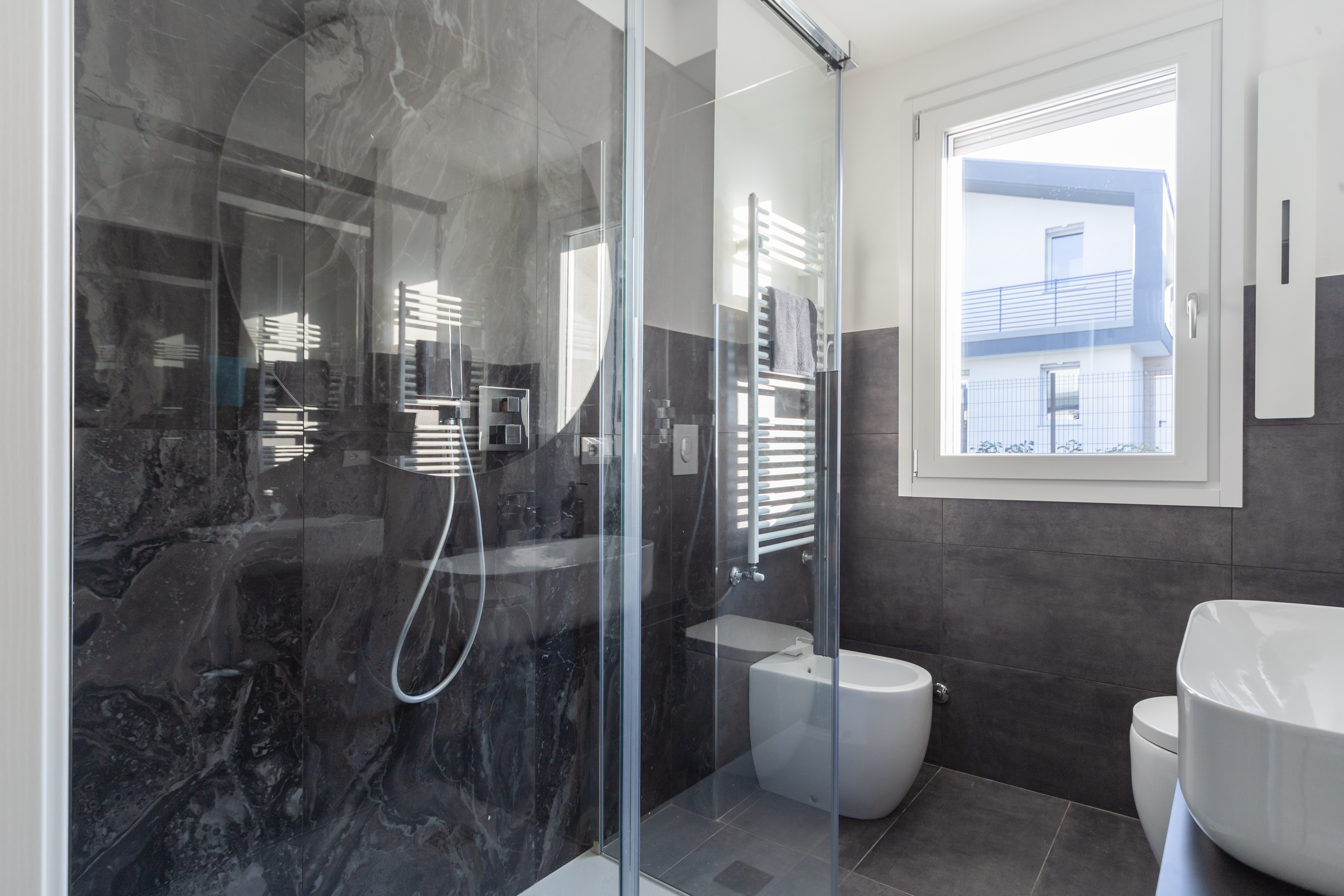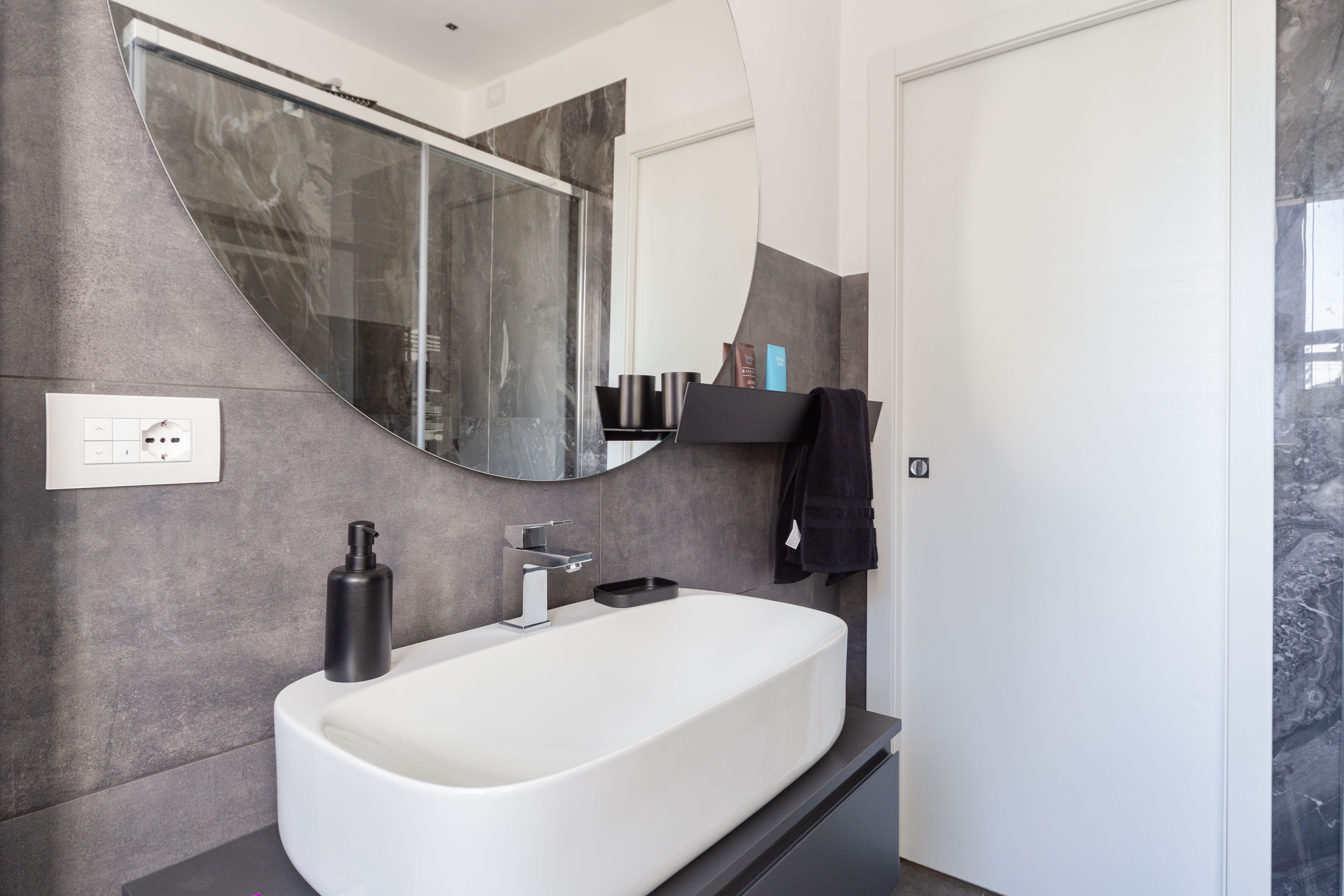 Per questo bagno i clienti hanno scelto di rivestire il pavimento ed alcune pareti con un gres porcellanato effetto pietra nella tonalità antracite, le pareti della doccia invece sono state rivestite con gres porcellanato effetto marmo nelle nuance del nero. L'eleganza dei riflessi del marmo si incontra con l'essenzialità della pietra che grazie ai suoi colori scuri accompagna e mette in evidenza i giochi di colore del primo materiale.